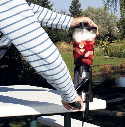 The human-powered Vortex Blender is perfect for picnics, tailgate parties, and camping, and for educating your children about energy. It features a 48 oz. (1.5 liter) graduated Lexan pitcher with an O-ring sealing top, a removable pour spout that's a 1 oz. shot glass, a brushed stainless steel finish, soft stable rubber feet, an ergonomic handle, two-speed operation, and a C-clamp for stable operation. The base fits inside the pitcher for easy packing. High speed operation is noisy, your camping neighbors will know you're making margaritas! China.