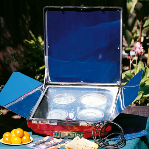 This unique solar oven cooks no matter what the weather. In sunshine, its rugged onepiece reflector panel combines with a double- paned window, double rubber seals and included booster panels to cook at temperatures up to 300°. Or just plug it into a 120V outlet to cook using 75% less power than a conventional oven. In changeable conditions, sensor controls can even be set to cycle between solar and electric heat as needed. An ideal solution for power-challenged RVs and hot summer kitchens, its tough clamshell suitcase design offers easy carrying, instant set-up, and compact storage. Includes four cooking pans, oven mitt, oven thermometer, 6' power cord, and instructional CD. 211/4"H x 211/4"W x 79/10"D. India.